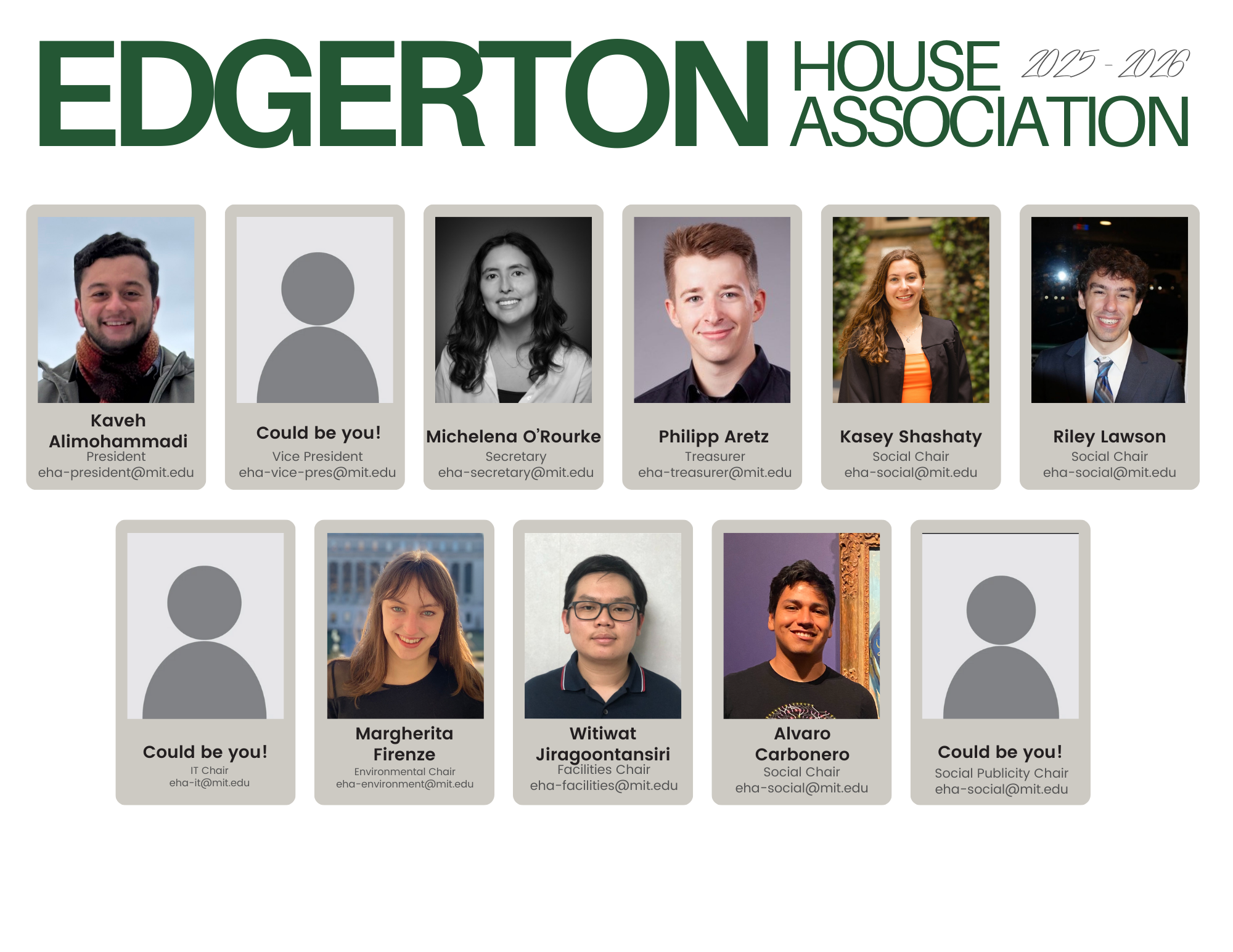 Social Chairs | Runs social events for Edgerton including biweekly socials, sports events, orientation and other events for new residents. Participates in the organization of campus-wide events. | eha-social@mit.edu |